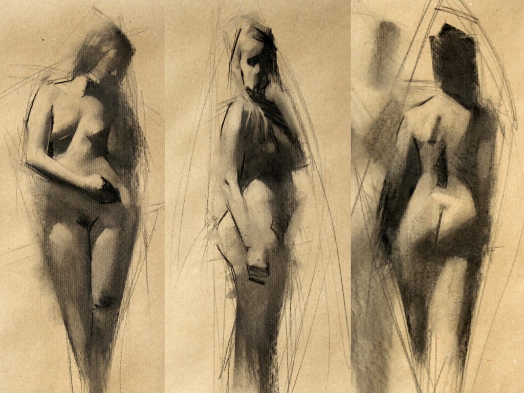 An untutored life drawing session with a range of short poses from 1-20 minutes.